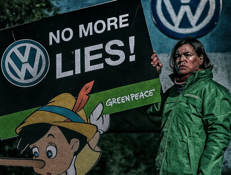 People protested Volkswagen after the company understated the carbon dioxide emissions from hundreds of thousands of vehicles. Greenpeace's legal action against Volkswagen is rooted in the belief that the company's business model violates future generations' right to climate protection.